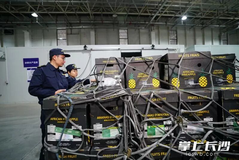 为保障贝宁菠萝进口,长沙黄花机场海关依托“优鲜通关”工作室,为进口企业提供政策咨询、手续审批、通关保障全流程服务,提前制定监管方案并实时追踪航班动态。货物抵港后,现场关员快速核对标签、检疫证书等证单,对包装及水果外观实施查验,实现快速放行。长沙黄花机场海关相关负责人表示,贝宁菠萝的常态化进口,将进一步推动长沙打造全国空港进口生鲜货物集散中心,也为湘非农产品贸易合作搭建起更高效的桥梁。