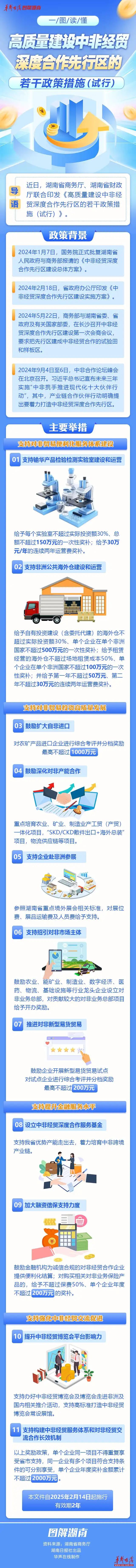 近日,湖南省商务厅、湖南省财政厅联合印发《高质量建设中非经贸深度合作先行区的若干政策措施(试行)》。《政策》介绍,单个企业年度奖补金额累计不超过2000万元。《政策》还有哪些亮点内容,一图带你读懂。