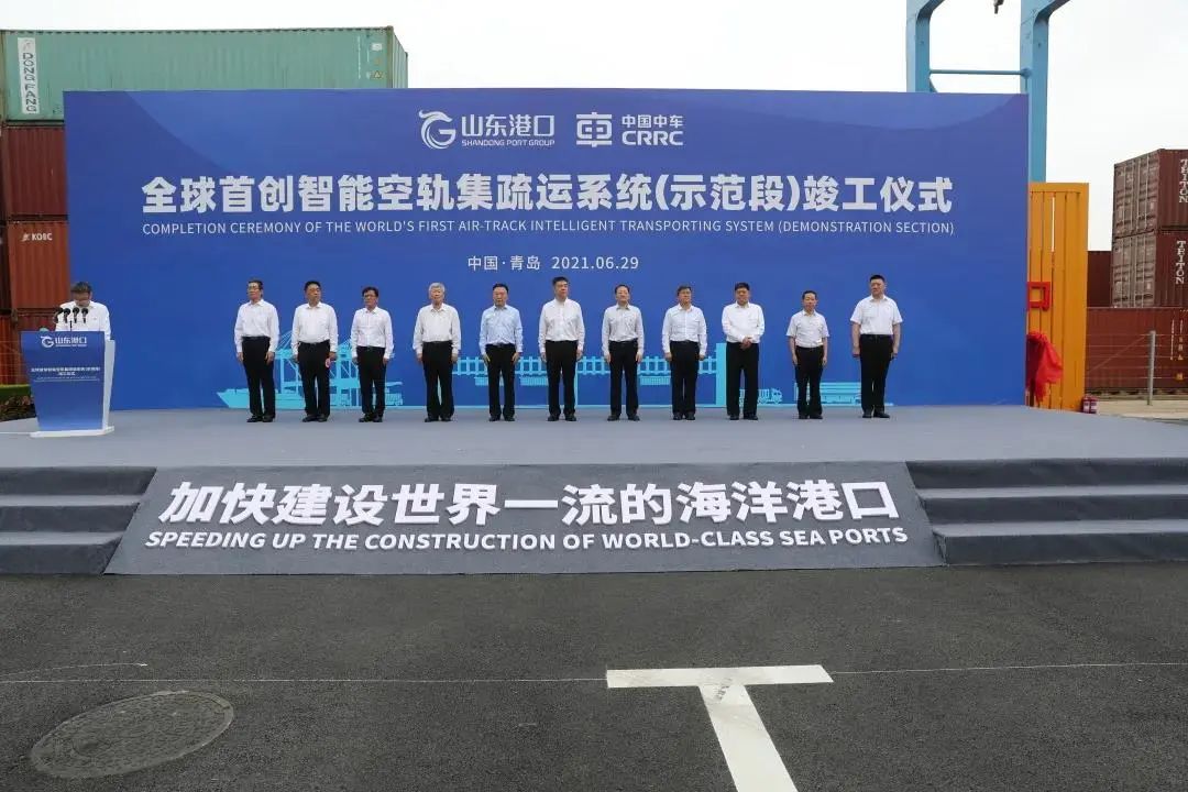 6月29日,全球首创智能空中轨道集疏运系统(示范段)竣工仪式在山东港口青岛港举行。该系统由“时代楷模”山东港口“连钢创新团队”和中车长江集团研发团队合作研发,实现了空轨技术与港口业务的有机融合,打通了集装箱运输港、船、站、场间的“最后一公里”,构建起更加安全、高效、环保、经济的立体智慧绿色港口集疏运新模式新样板,实现了港区交通由单一平面向立体互联的革命性突破升级。