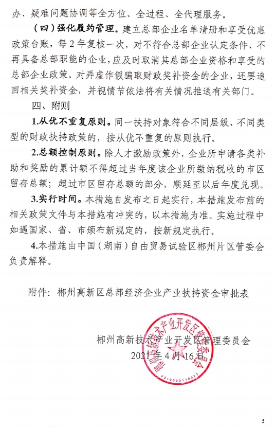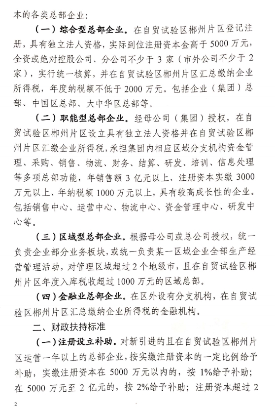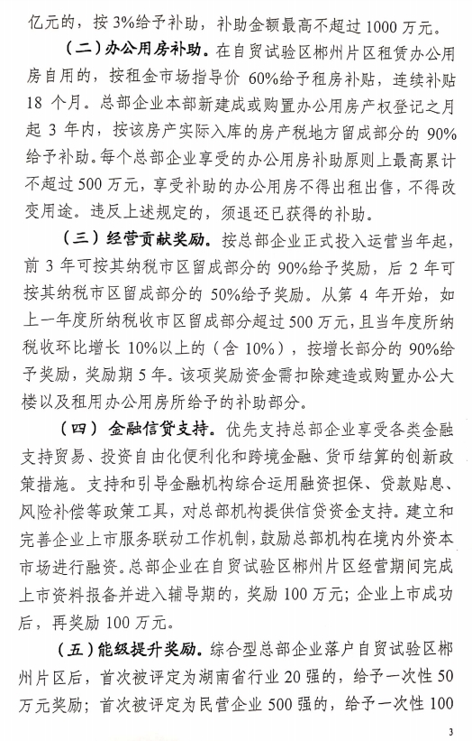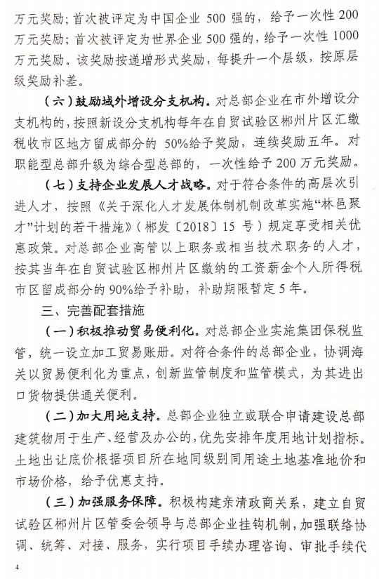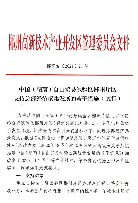 《中国(湖南)自由贸易试验区郴州片区支持总部经济聚集发展的若干措施(试行)》