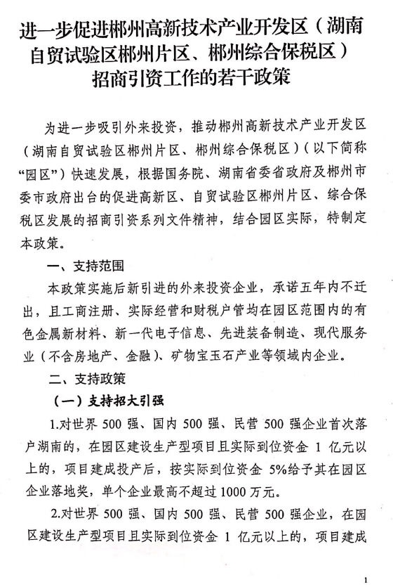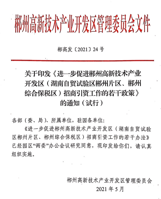 关于印发《进一步促进郴州高新技术产业开发区(湖南自贸试验区郴州片区、郴州综合保税区)招商引资工作的若干政策》的通知(试行)