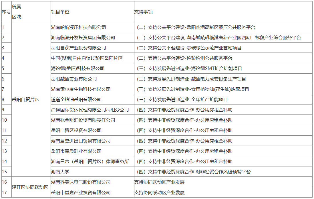 根据《湖南省财政厅关于下达2025年自贸试验区发展资金的通知》(湘财外指〔2025〕34号)精神,市商务局会同市财政局联合印发了《关于做好2025年岳阳自贸片区及协同联动区激励资金申报工作的通知》。按照文件支持方向,通过项目单位自主申报,岳阳自贸片区、经开区协同联动区初审,我局与市财政局联合复审,经报请市人民政府同意,拟对湖南哈航液压科技有限公司等17个项目给予支持。