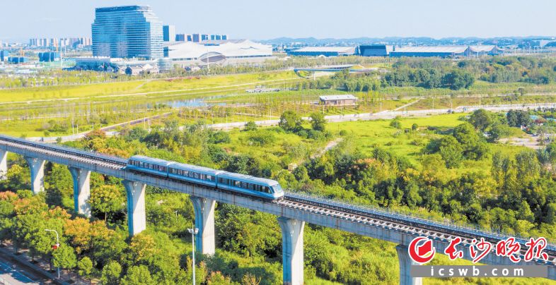 从长沙国际会展中心广场放眼望去,高铁与磁悬浮列车在不远处疾驰而过,一架架飞机腾空而起,在地铁的疾驰中,城市脉搏跳动有力。