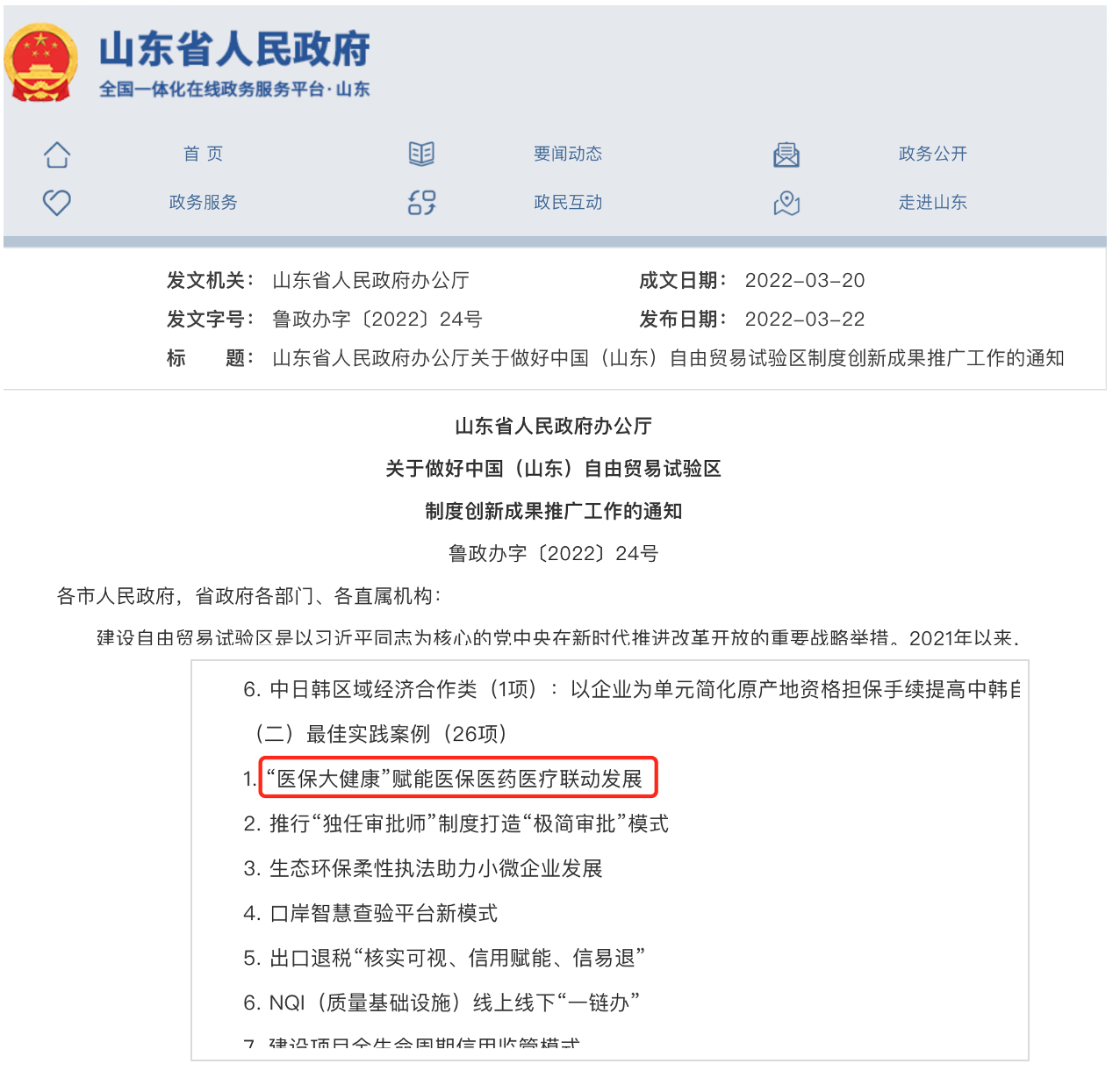 3月22日,山东省政府办公厅印发《关于做好中国(山东)自由贸易试验区制度创新成果推广工作的通知》,明确山东省自贸试验区探索出25项改革试点经验和26项最佳实践案例将在全省范围内推广。其中“医保大健康赋能医保医药医疗联动发展”最佳实践案例将作为对应用场景具体、具有借鉴意义的创新成果供各地学习借鉴。