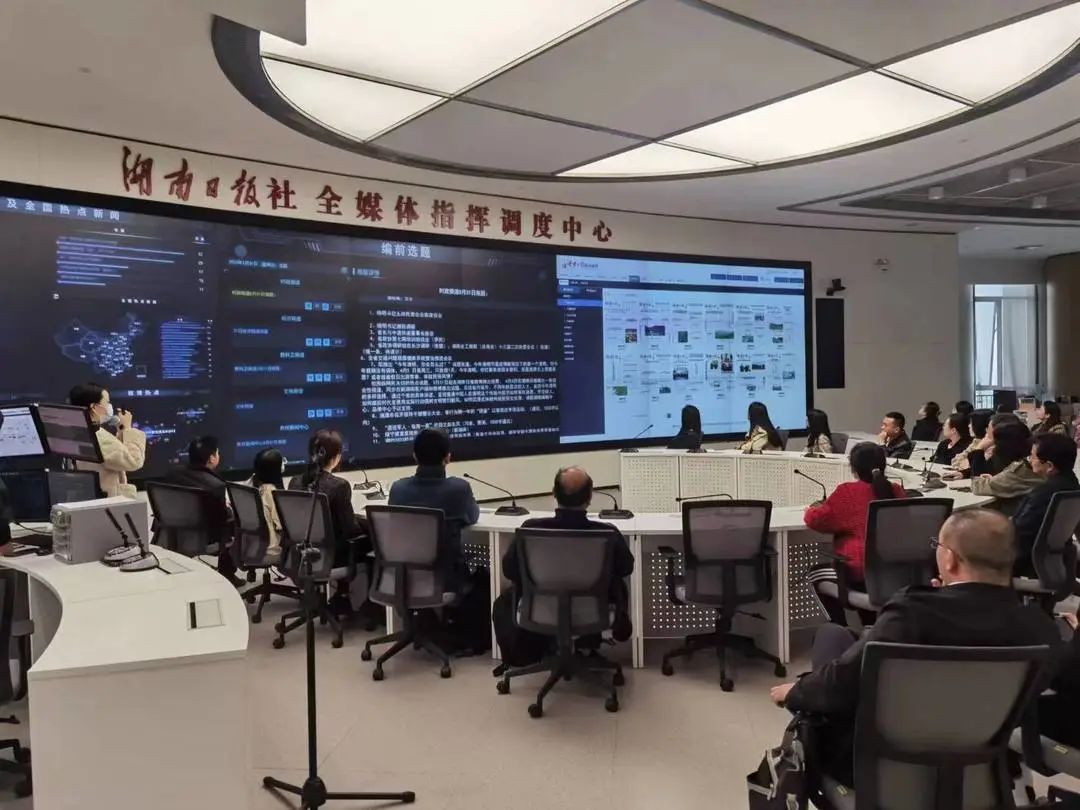 ▲与会人员在湖南日报社全媒体指挥调度中心参观了解新闻生产流程。