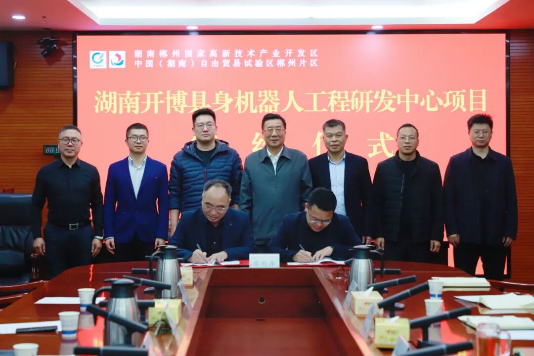 1月15日,湖南开博具身机器人工程研发中心项目签约仪式在郴州自贸片区、高新区举行。园区党工委书记王卫东,党工委委员、管委会副主任曹为群及园区相关部门负责人共同见证。